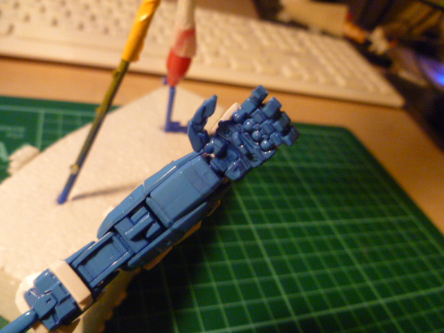 Body and head assembled and painted, arms half-painted. As luck would have it I have run out of the french blue spray I was using.. which is puzzling to me as they usually last for at least 2 HG models.. I think my alternative method of assemble, then paint is causing an awfil amout of wastage. Anyways, with another 2 cans on order all activity on this has ceased for a while.. frustrating! Some WIP pix below.